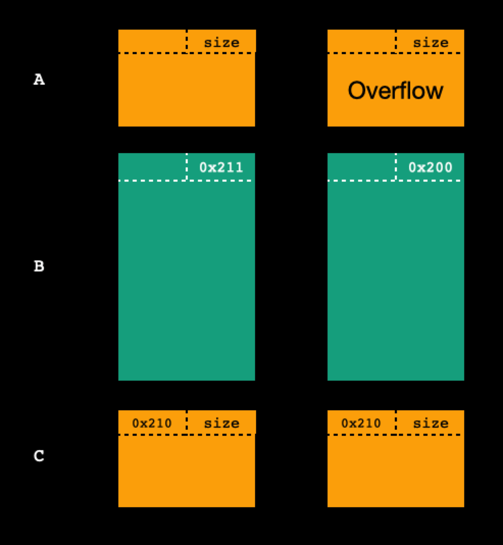 1 2 3 4 5 6 7 8 9 10 11 12 13 14 15 16 17 Allocated chunk | PREV_INUSE --> old prechunk Addr: 0x5ad23af438c0 Size: 0x110 (with flag bits: 0x111) ---------------------------------------------- vcitim chunk Allocated chunk | PREV_INUSE --> new prechunk Addr: 0x5ad23af439d0 Size: 0x110 (with flag bits: 0x111) Allocated chunk | PREV_INUSE --> overlap chunk1 Addr: 0x5ad23af43ae0 Size: 0xd0 (with flag bits: 0xd1) Allocated chunk | PREV_INUSE --> overlap chunk2 Addr: 0x5ad23af43bb0 Size: 0x20 (with flag bits: 0x21) ---------------------------------------------- victim chunk ... --> post chunk