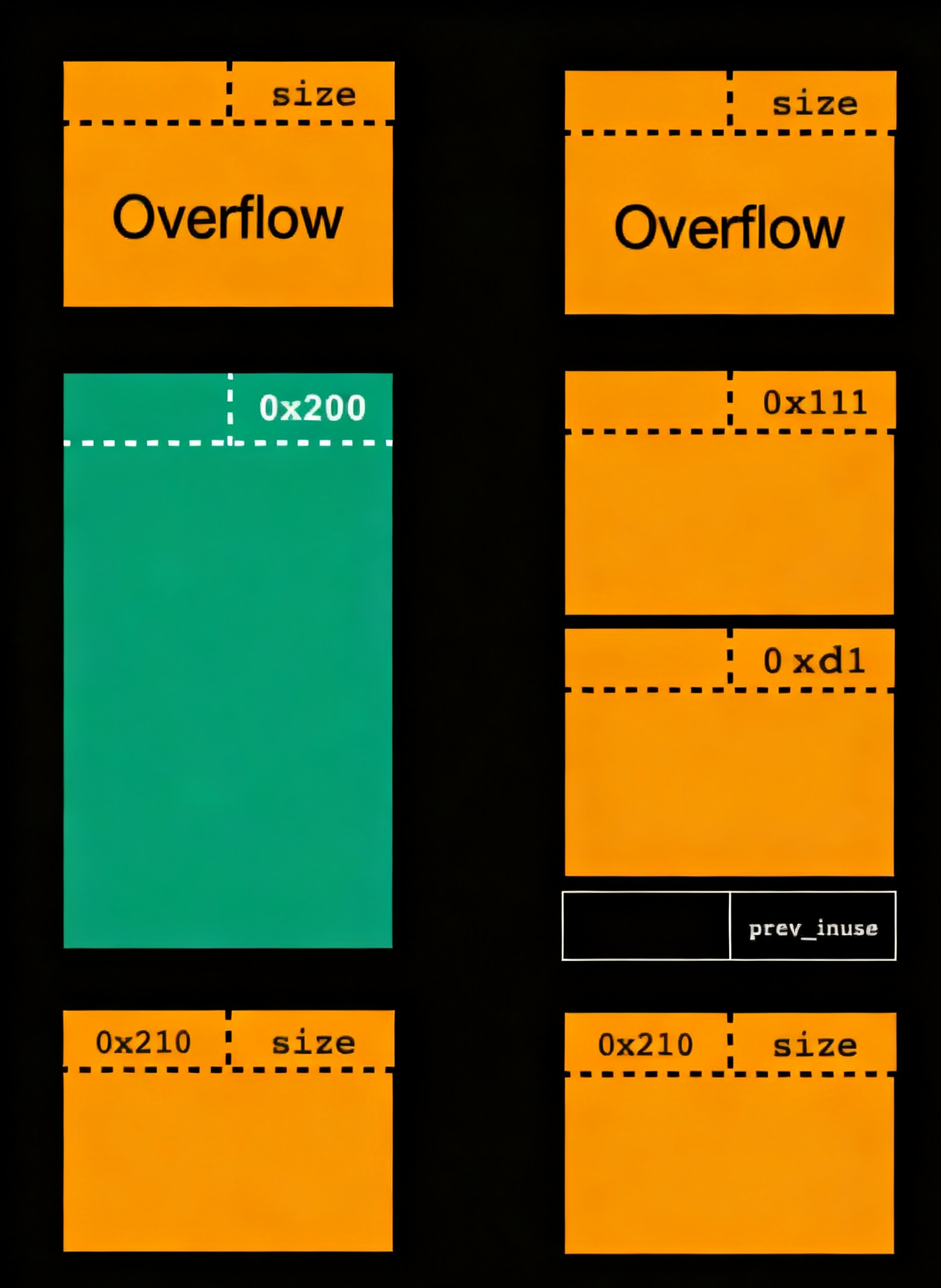 这样就会使得new prechunk和victim chunk以及post chunk合并在一起,产生两个overlap chunk……吗? 我们简单在这题实操